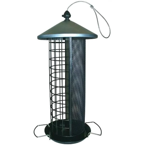 Een grote voedersilo waarbij je tegelijkertijd mezenbollen en noten of zaden kan aanbieden.