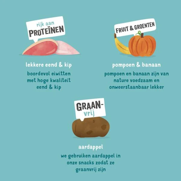 Edgard&Cooper hondensnack met sappige kip, eend, pompoen en banaan. Men zegt wel eens dat de beste cadeautjes in kleine pakjes zitten. Wel, deze divine duck and chicken jerky is daar een goed voorbeeld van. Elke hond, braaf of rebels, verdient pakken liefde (met jerky). Je hoort ons niet zeggen dat onze jerky beter is dan over zijn buik(je) wrijven, maar het staat toch met stip op twee.