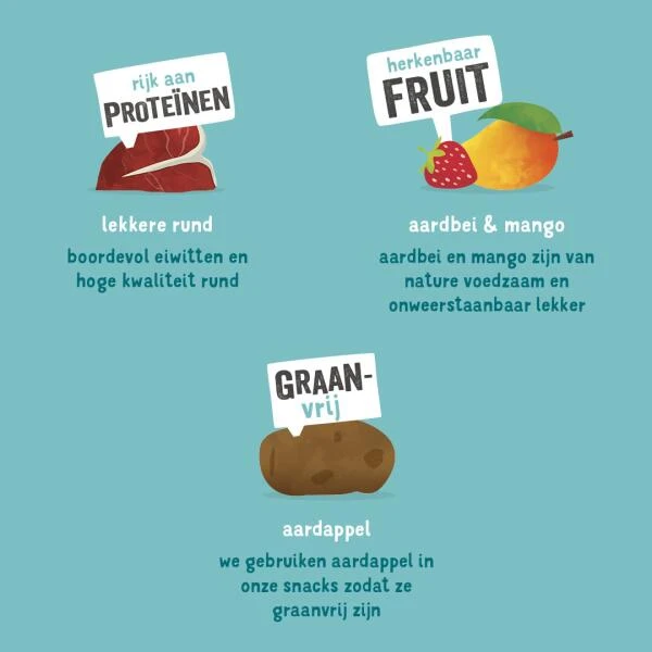 De beautiful beef jerky zit vol goede dingen. De beste stukjes rund worden traag gegaard om die verrukkelijk vlezige smaak optimaal te bewaren. Dankzij het koolzaadolie blijft het vlees lekker sappig, plus aardbei en mmm…mango! Dit geeft de voedingswaarde een natuurlijke kick. Deze eiwitrijke, graanvrije snacks zijn perfect voor elke hond groot of klein, dik of dun. De verpakking is 100% biologisch afbreekbaar.