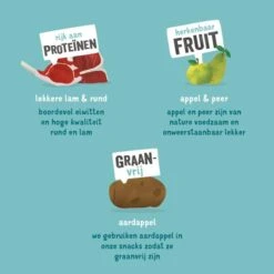 In deze eenvoudige, graanvrije snack zit véél sappig lams- en rundvlees boordevol eiwitten, met een zorgvuldig uitgebalanceerde mix van peer en appel. Dankzij een scheutje koolzaadolie: blijft de jerky lekker smeuïg. Deze snacks worden traag gegaard: zo blijven die goeie smaak en andere goodies tiptop bewaard. De hondensnacks zijn verpakt in 100% biologisch afbreekbare zakjes.