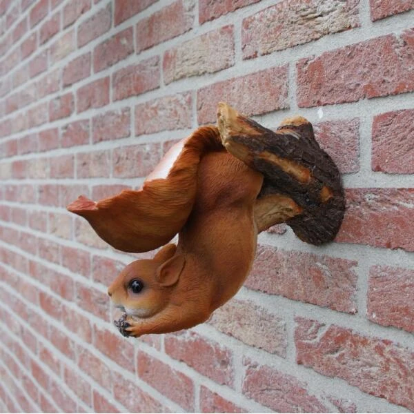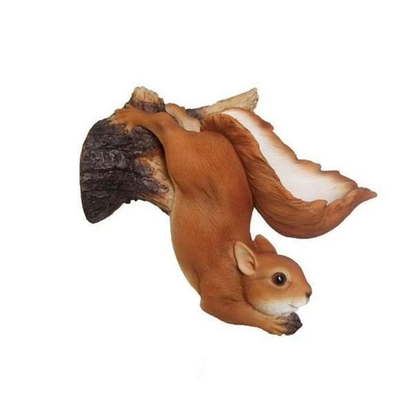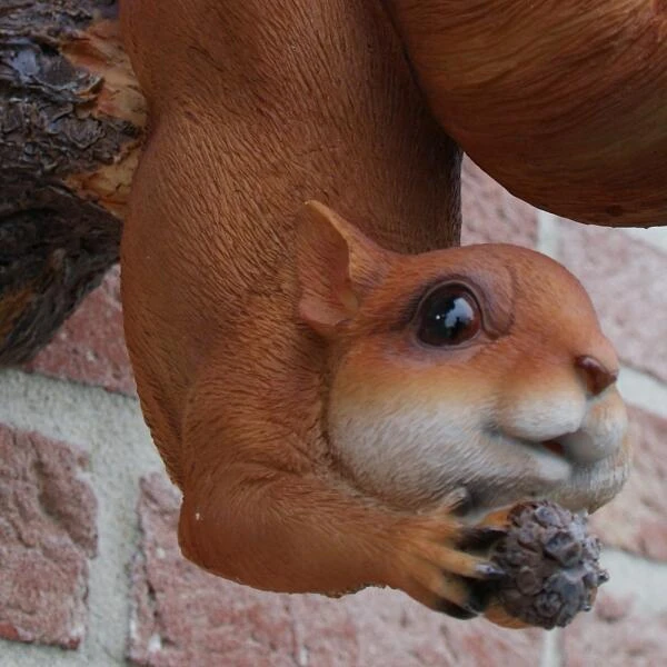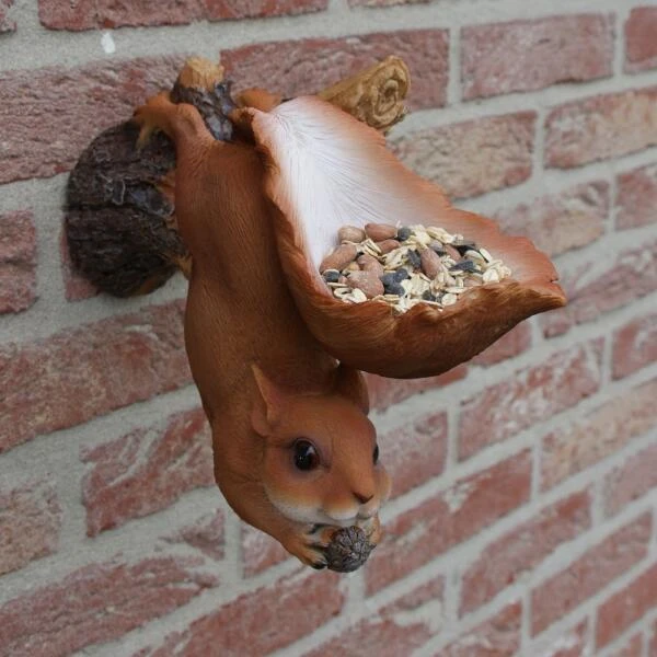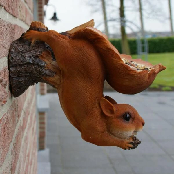 Deze leuke eekhoorn hangt ondersteboven aan een tak met zijn grote uitwaaierende staart als voederschaal voor vogels. Vul de schaal met een lekkere zadenmix en geniet van de tuinvogels die in de staart van de eekhoorn komen smullen. De eekhoorn zelf geniet ondertussen van een lekker nootje tussen de voorpoten.