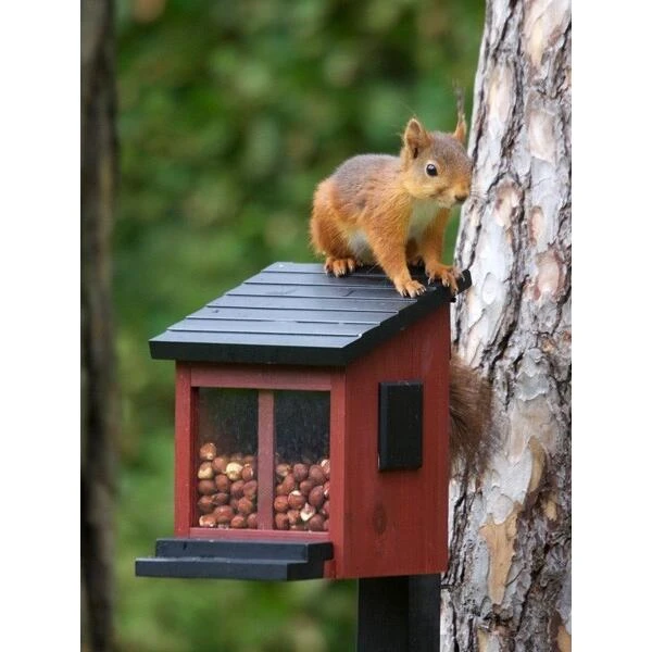 De Ekorrmatare wordt gevuld met noten of speciaal eekhoornvoer die voor de eekhoorn zichtbaar opgeslagen liggen achter grote ramen aan de voorkant. De eekhoorn zit op de uitstekende houten veranda en gebruikt z’n hoofd om het dak op te lichten om bij het voedsel te komen. Eekhoorns zijn intelligente dieren en leren snel hoe zij bij allerhande lekkernijen kunnen komen, hoe moeilijk dat soms ook lijkt te zijn. Het dak sluit weer op het moment dat de eekhoorn klaar is met eten zodat andere dieren en vogels niet bij het voer kunnen.