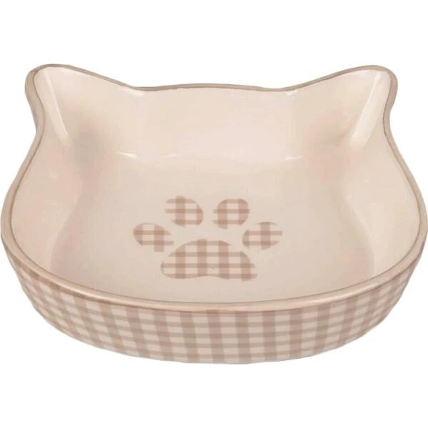 De eetpot is vervaardigd uit keramiek en heeft aan de binnenzijde een print van een kattenpoot en aan de buitenzijde een ruitdesign.