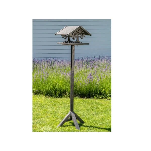 Het voederhuis wordt geleverd zonder statief maar kan met de bijhorende voetjes iets verhoogd worden. Het hout heeft een zwarte coating dat bestand is tegen slechte weersomstandigheden. Plaats het op een beschutte plek in de tuin of hang het op aan een boom. Stel het huisje op een vogelvriendelijke plek waar de vogels veilig kunnen eten.