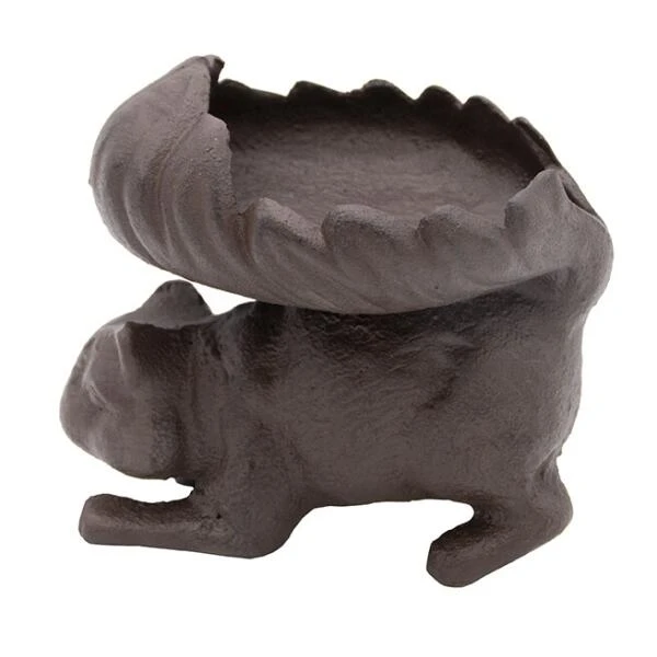 Eekhoorn in gietijzer met holle pluimstaart als eet- of drinkschaal. Een origineel en decoratief voederschaaltje voor in de tuin. Ook toepasbaar in huis als originele schaal voor noten of decoratie zoals potpourri, sierzand met kaars…