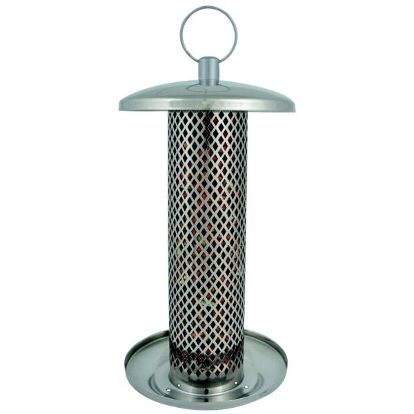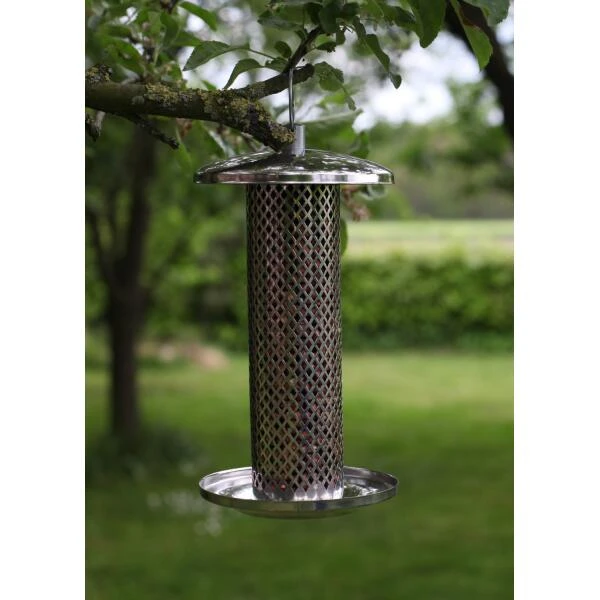 De automaat wordt gevuld via het afneembare deksel en heeft een geperforeerde onderschaal en een stevige ophanghaak.