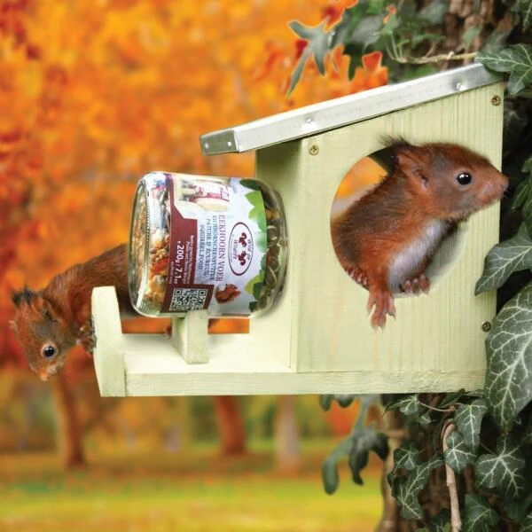 Eekhoorns zijn echte acrobaten en gaan slim en handig te werk voor het bemachtigen van voedsel. Ze zijn een meester in het wegjagen van vogels en het beschadigen van voedertafels tot grote spijt van heel veel vogelliefhebbers. Daarom dit uniek voederhuis voor eekhoorns waar ze lekker van hun eigen potje eekhoornvoer of pindakaas kunnen smullen.