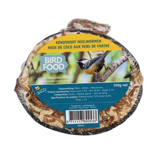 De halve kokosnoot bevat een energierijke mengeling van meelwormen, oliën en vetten waar onze gevleugelde tuindieren graag van smullen. De vogels kunnen zich goed vasthouden aan de halve kokosnoot tijdens het eten en gebruiken de kokosvezels aan de buitenzijde van deze kokosnoot graag als nestmateriaal.