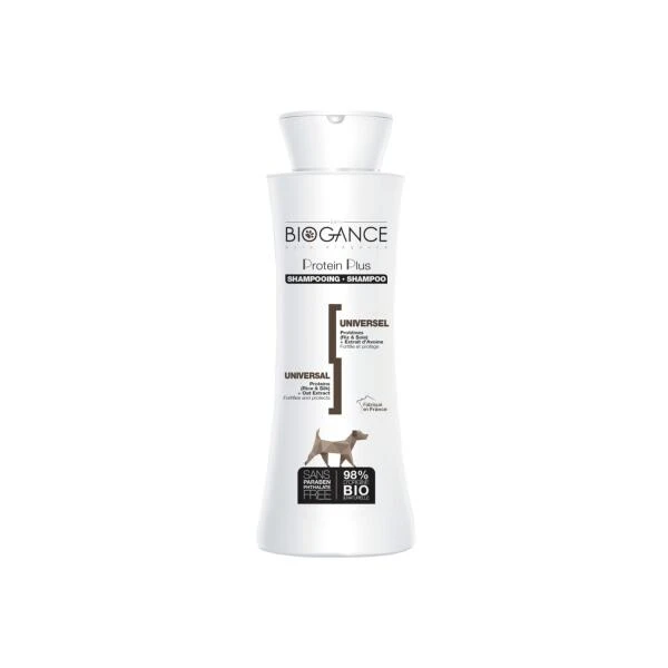 De Biogance Protein Plus universele hondenshampoo is samengesteld uit havermelk, zijde- en rijstproteïnen voor een zachte reiniging.