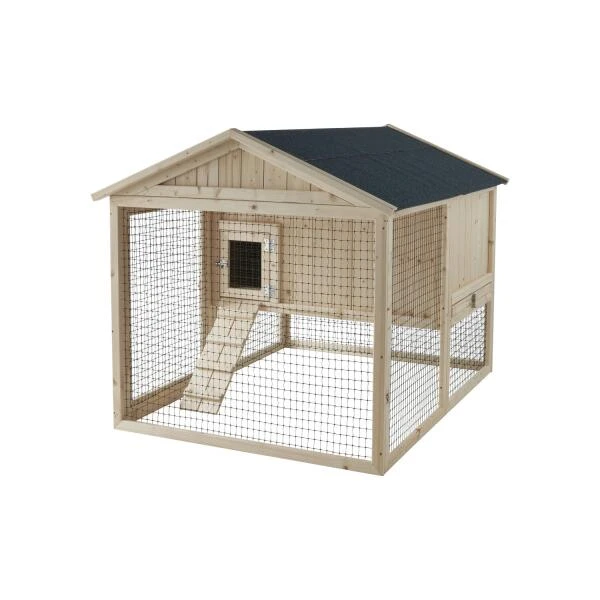 Geef jouw kippen een veilige en ruime thuis met dit mooie kippenhok. Het hok bestaat uit een verhoogd nest met zitstok, toegankelijk via het loopplankje, en een ruime buitenren waar ze vrolijk kunnen rondscharrelen. Het geheel is overdekt met een waterdicht dak in bitumen. Met dit hok zijn jouw kippen beschermd tegen roofdieren, terwijl ze toch nog voldoende ruimte hebben.