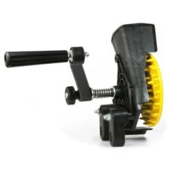 Met een zwengel, uitgerust met houten handvat, trek je de maïskolven door de maïskolfontpitter. Een harde kunststof schijf met noppen wrijft langs de maiskorrels en scheidt de korrels vlotjes van de kolf.