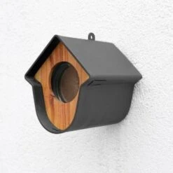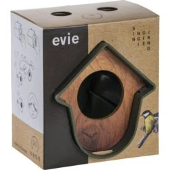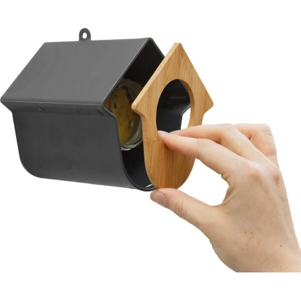 Leuke en bovendien zeer originele pindakaaspot houder met een uniek design. De kunststof houder heeft de vorm van een nestkastje en is enig afgewerkt met een houten uitneembaar frontpaneeltje.