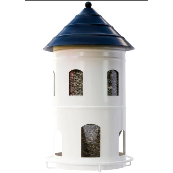 De reuze voedersilo heeft meerdere voerdispensers zodat veel vogels tegelijkertijd kunnen eten. Door de vele raampjes is het makkelijk van veraf te zien hoeveel de silo nog met voer gevuld is. De voedersilo wordt het best op een paal gemonteerd met de bijgeleverde schroef. Het voederhuis is gemaakt van waterbestendig gepoederlakt staal en de container van gerecycleerd kunststof.