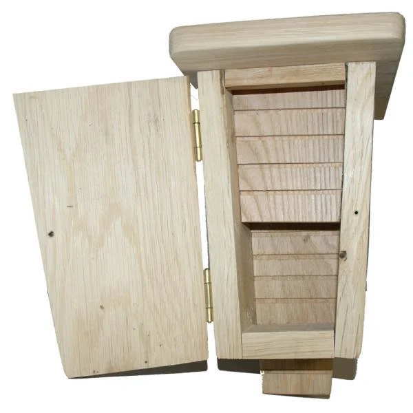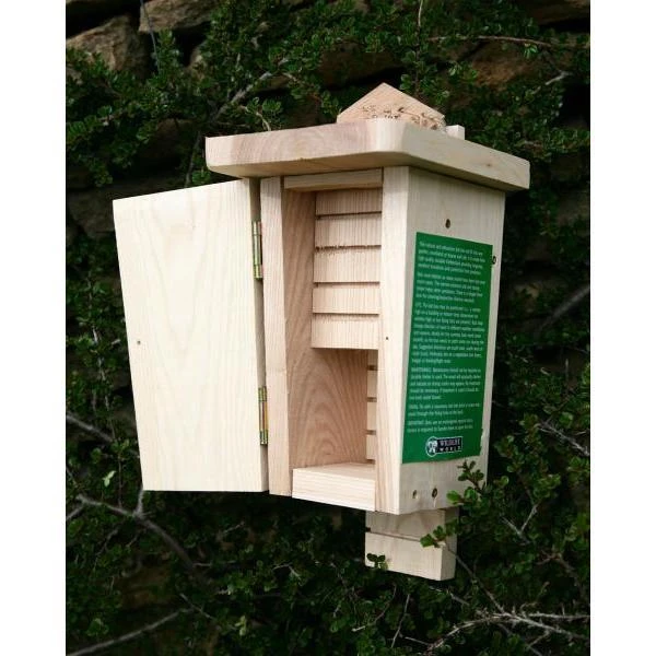 De smalle ingang van deze vleermuizenkast zorgt ervoor dat de vleermuizen rustig slapen, zonder bedreiging van roofvogels. Het luik aan de voorkant kan geopend worden ter observatie of om de vleermuizenkast te reinigen. Doe dit niet in de periode van maart tot oktober, aangezien je daarmee de vleermuizen kunt afschrikken.