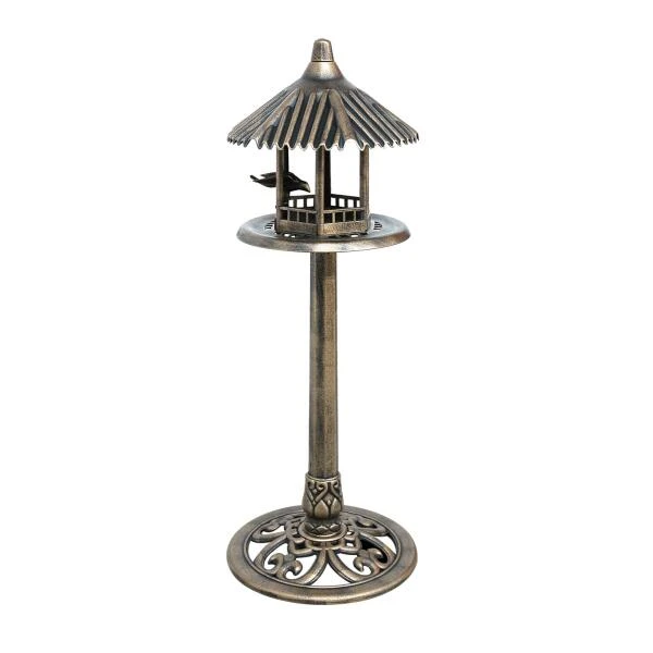 Decoratief, rond vogelvoederhuis in kunststof. Dit weerbestendige, bronskleurige voederhuis met een klassieke look lijkt uit een kasteeltuin te komen. Het grote dak beschermt het voeder op de voedertafel zodat het langer vers en droog blijft.