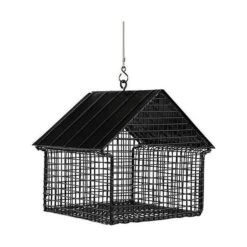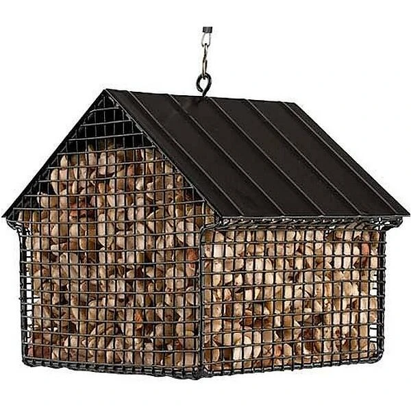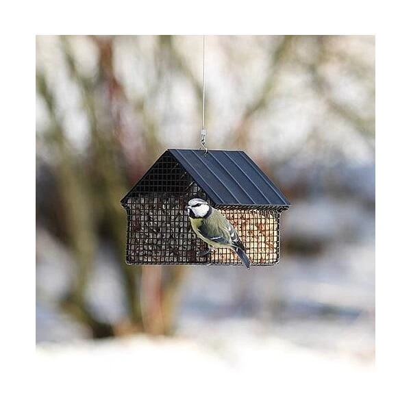 De houder is volledig uit metaal en is voorzien van een zwarte coating. De ene zijde van het dak klapt open om de pinda’s makkelijk te kunnen aanvullen. Met de bijgeleverde metalen ophangdraad kan je het voederhuisje in een boom hangen of aan een voederhaak.