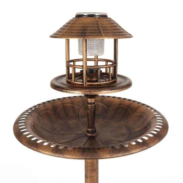 Een groot en sierlijk vogelhotel met voederbak/waterschaal, solar lamp en bloembak in één. Een combinatie van een vogelbad met voedertafel die in elke tuin past, klein of groot. Het is een eenvoudig te monteren geheel in stevig kunststof afgewerkt met een stijlvolle, antiek ogende bronzen kleur.
