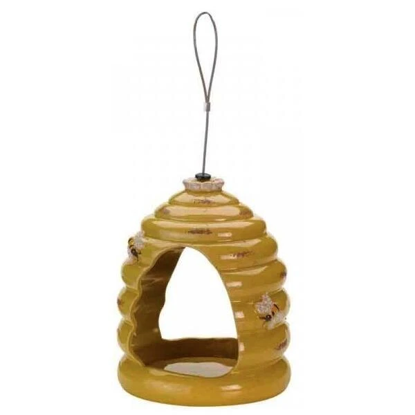 Een origineel voederhuis in de vorm van een bijenkorf, ideaal om de vogels in jouw tuin te voederen met zaden en andere lekkernijen. Het voederhuis is voorzien van decoratieve bijtjes en vormt daardoor ook een heel mooi element in de tuin.