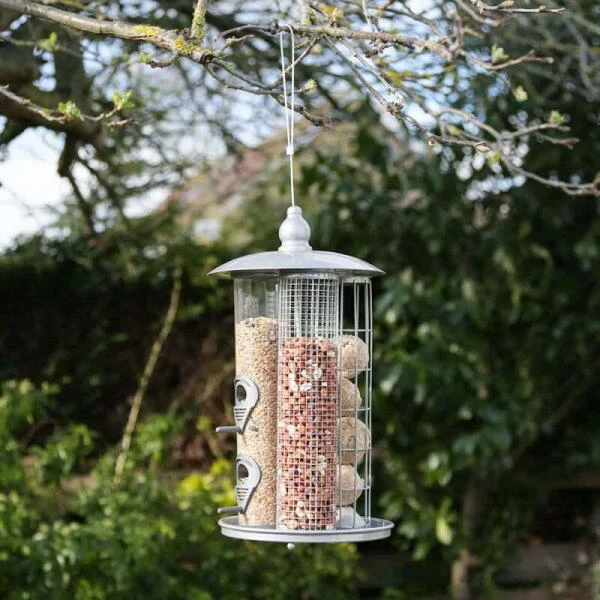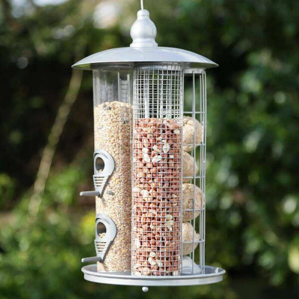 DELUXE voedersilo 3 in 1 voor het voederen van tuinvogels. De silo heeft drie verschillende kokers waarin je tegelijkertijd pindanoten, mezenbollen en een zadenmix kan aanbieden.